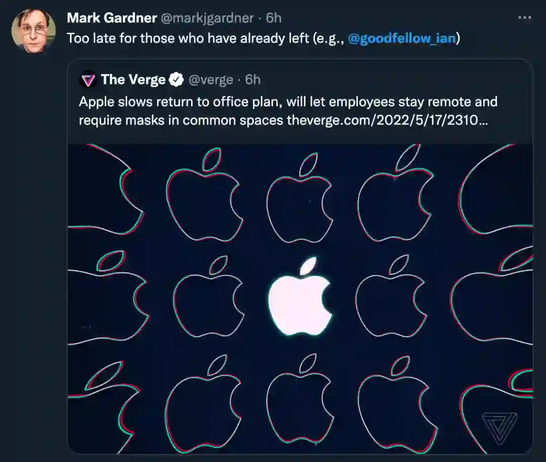 本月初,任苹果机器学习总监的 Ian Goodfellow 宣布在加入公司三年后辞职,部分原因是苹果公司关于重返办公室工作的政策。