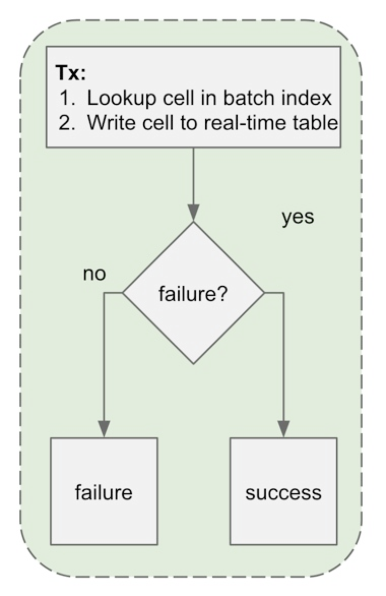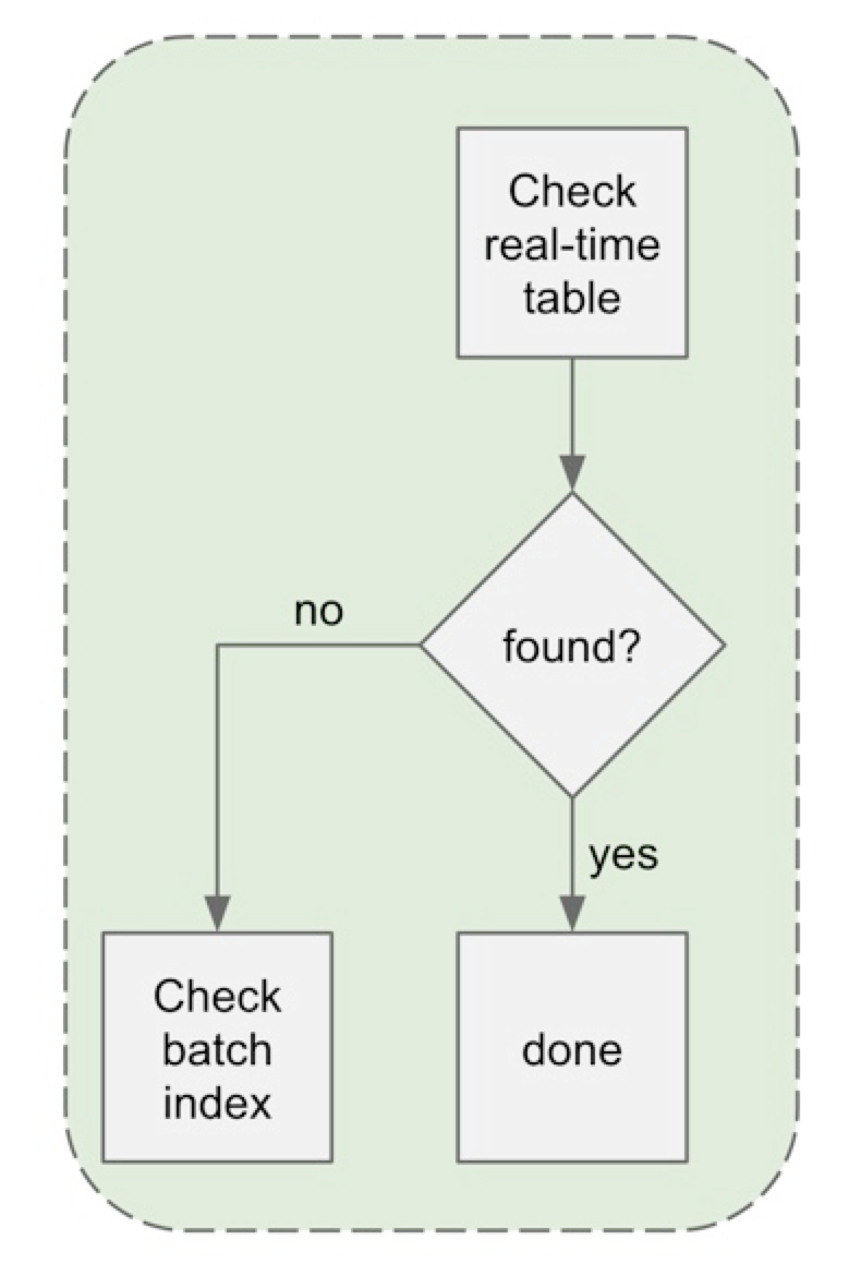 单个单元格的读取还是和平常一样进到实时表,因为大多数请求(>90%)都是针对最近的数据。如果成功,请求之后就会终止。如果不成功,请求会“溢出到”批处理索引,找到批处理表,并在同一查询中获取它。下图显示了这个流程。