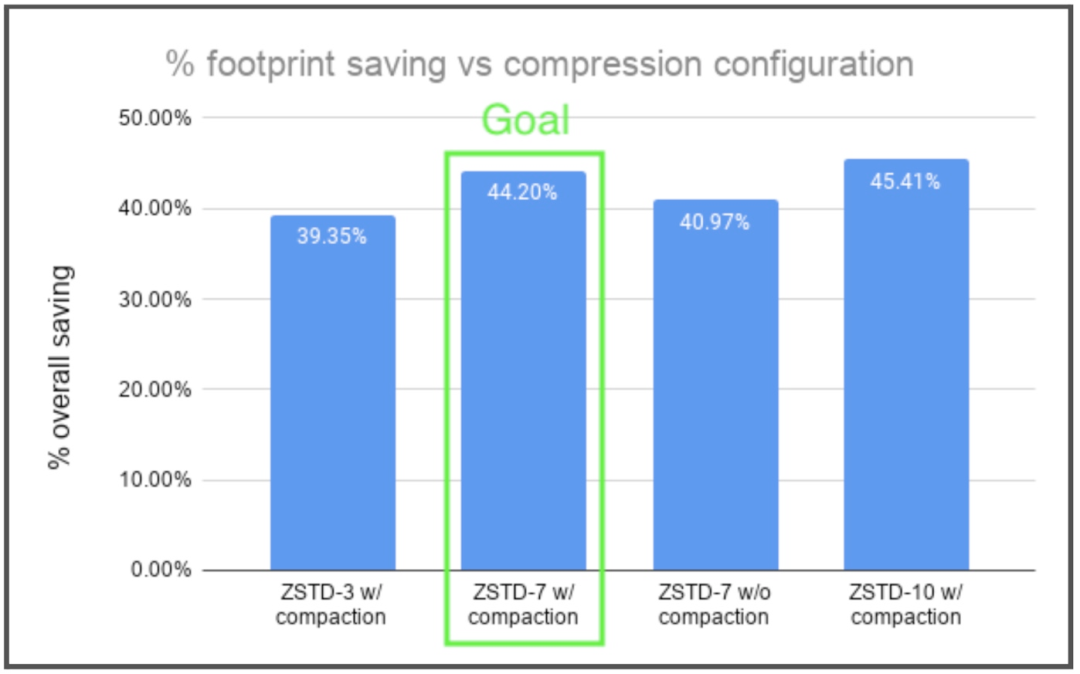 在这种设置下,总体压缩率约为 40%,如下图所示。该图还显示了我们尝试过的其他配置,这些配置出现了收益递减或空间节省降低的情况。