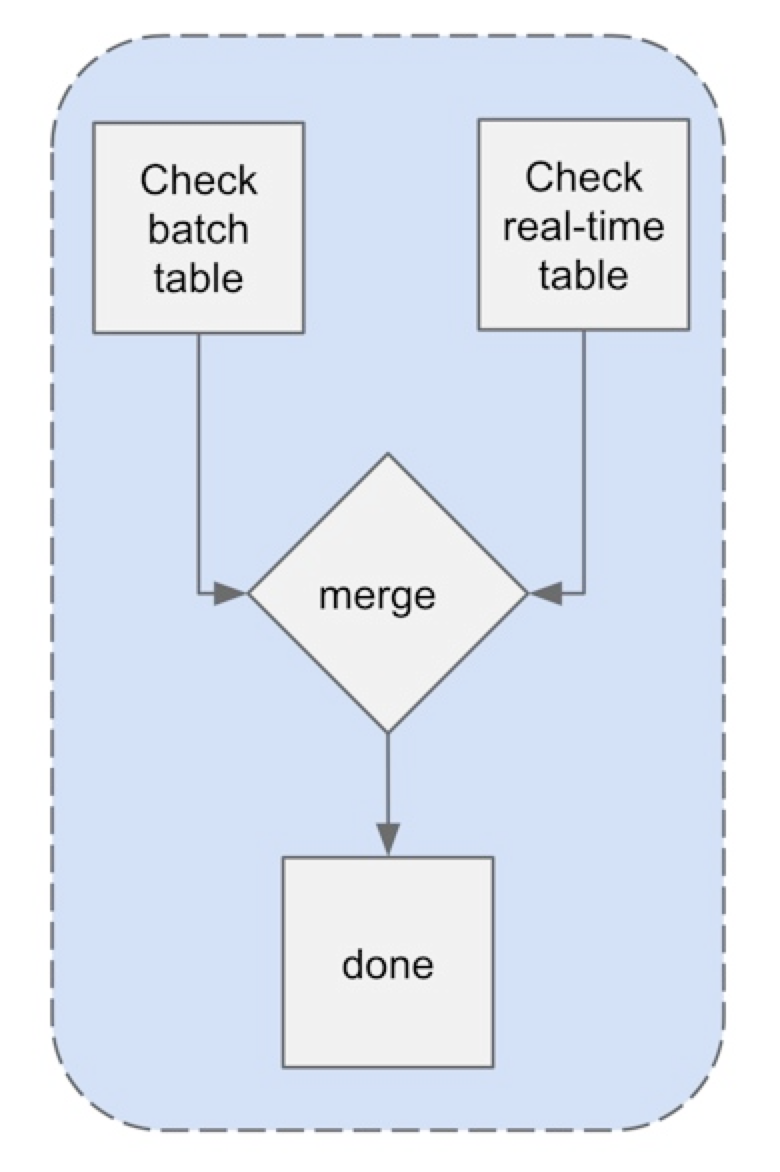 虽然我们考虑了几个备选方案,但在这里我们只讨论最终设计。整体架构如下图所示。后端有批处理表和实时表。批处理后端存储从实时后端迁移过来的旧数据。实时后端与旧的后端完全一样,但只用来存储最近的数据。也就是说,新数据总是被写进实时后端,就像以前一样。一旦数据在一段时间后变冷,就会被迁移出来。