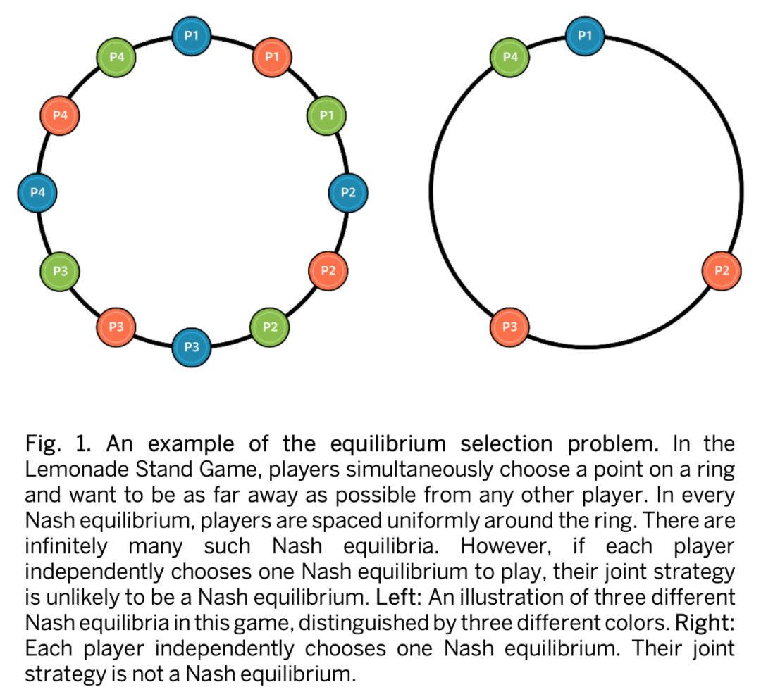 即使在多人博弈中每个玩家都得到了纳什均衡策略,这样执行下来的结果未必是纳什均衡的,Lemonade stand game 就是一个典型例子[4]。在 Lemonade stand game 中多个玩家同时在一个圆环上选择位置,目标是距离别人越远越好。这个博弈的纳什均衡是每个玩家在圆环上均匀分布,能达到这样效果的策略有无数多种,倘若每个玩家独立计算一种,则产生的联合策略不一定是纳什均衡,如图 1 所示。