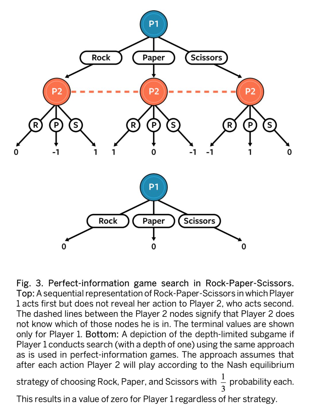 这个例子证明在不完美信息子博弈中,叶子节点没有固定值,相反,他们的值取决于探索者在子博弈中选择的策略。原则上,这可以通过让子博弈叶子节点的值作为搜索者在子博弈中的策略的函数来解决,但是这在大型游戏中是不切实际的。
