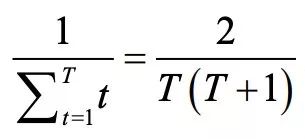 由于反事实值和期望值的差值是被添加到后悔值中而不是取代后悔值,所以玩家第一次随机行动(通常是一种差策略)仍会影响该后悔值。因此这种策略是一种面向未来而采取的策略。在一般的 CFR 方法中,第一次迭代的影响以 1/T 速率衰减,T 为迭代次数。为了快速削弱这种早期“坏”策略带来的影响,Pluribus 在早期迭代中采取线性 CFR 方法(在后续迭代中作者不采用这种方法,因为乘法带来的时间成本不值得这么做)。因此第一次迭代的影响将以如下速率衰减: