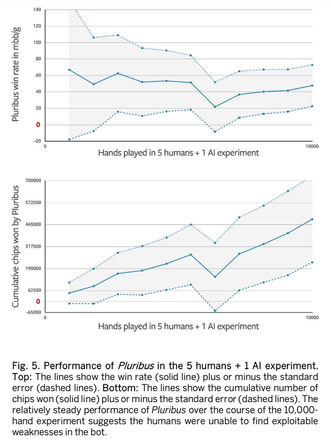 作者采用了两种模式评估 Pluribus 对阵人类选手。1、5 个顶尖人类选手 +1 个 AI (5H1 AI );2、1 个人类顶尖选手 +5 个 AI (1H5AI )。作者通过使用 AI 领域中的标准度量,mbb /game来衡量 AI 表现。该指标用来衡量每千手扑克平均赢得多少大盲注(Big Blind 大盲注 简称 BB 庄家左边第 2 个位置,牌局开始前需固定下注的位置,一般下注额为当前牌桌底注)。此外,作者利用 AIVAT 技术(variance-reduction technique)来减少游戏中的运气成分。