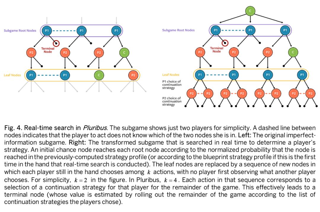 Pluribus 使用一种新方法,其中搜索者明确地认为任何或所有玩家可以转移到子博弈的叶节点之外的不同策略。作者假设当到达叶子节点时,每个玩家可以在 k 个不同的策略之间进行选择以进行接下来的博弈。在本文中作者设定 k=4。第一种是预先计算的蓝图策略;第二种是一种改进的倾向于 folding 的蓝图策略;第三种是倾向于 calling 的蓝图策略;第四种是倾向于 raising 的蓝图策略。(以上 folding、calling、raising 均为牌桌策略,分别为弃牌、跟注和加注)