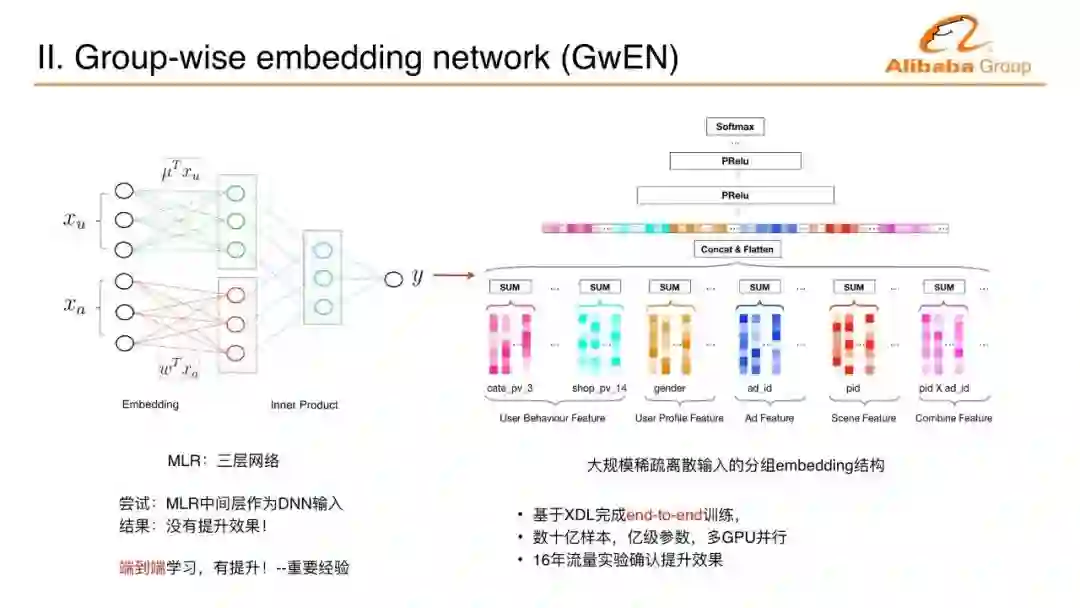 后面一个突破,把embedding的学习和多层感知机的训练放在一起端到端学习,比原来的技术有非常明显的提升。这也能够解释为什么深度学习近十年才有大的突破和进展。如果没有端到端训练,用浅层模型每次训练产生feature再训练再产生feature一层一层叠下去。之前很多人尝试都没有得出过这种深度的层叠网络,直到端到端学习,使得我们在很多问题上得到突破。我们把分组的embedding竖过来,上面是多层感知机,这就变成阿里妈妈第一代深度学习网络,基于数百亿样本、数亿的特征维度,多GPU的端到端的训练来完成这样一个业务上线。这个上线的效果使CTR和GMV的提升非常明显。