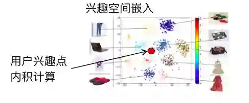 前面介绍了经典的比较标准化的深度学习在广告里面的应用,接下来我们的方向在互联网数据中,怎么样能够通过对用户行为的洞察做更好的深度学习模型。这里是一个例子,我们刚才讲到嵌入式技术,把每个商品通过嵌入式技术在嵌入空间表示一个点,一组特点用户的一系列行为通过嵌入技术表述成一个点,这个可能会代表用户。这个用户点跟商品做最后的兴趣度的计算,假设说这个计算就是跟距离成正比的话,用户的点会表示成这样一个兴趣函数在空间里面就会变成一个单峰函数,用户所处的点的地方的兴趣度最大,越远兴趣度越小。