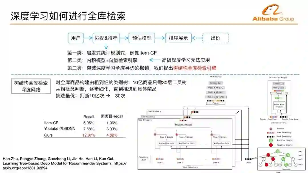 我们针对怎么样用任意的深度学习来做全库的检索寻优,提出树结构的全库检索引擎,它的想法也比较直观,把整个商品建立成一棵层次化的树,有十亿产品,30层的二叉树,它的叶子层可以容纳20亿商品。我们的深度学习层每层扫描,每层找到最优,下层的节点在上一层非最优的孩子里面不继续计算,相当于丢弃,直到最后找到全库最优的,把10亿次的衡量变成30次从上到下的衡量,解决深度学习如何在全库找最优的问题,解决了检索和匹配的问题。这样的方法跟前两代方法比较,推荐召回率有非常明显的提升。