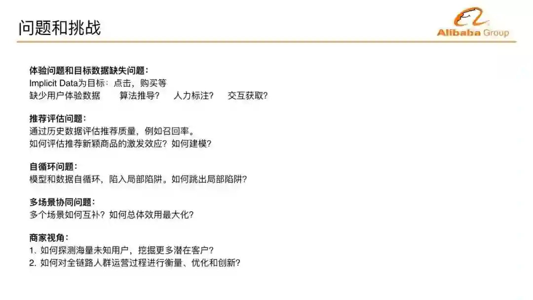 在很多APP上推荐场景有很多,多场景下如何来做协同?从商家视角,每个商家其实面向的都是全量的海量用户,如何探测潜在的客户。商家面对的是整个消费者的运营过程,潜在兴趣阶段、购买阶段整个链路上如何进行优化创新,这是面对商家在商业上希望能解决的问题。