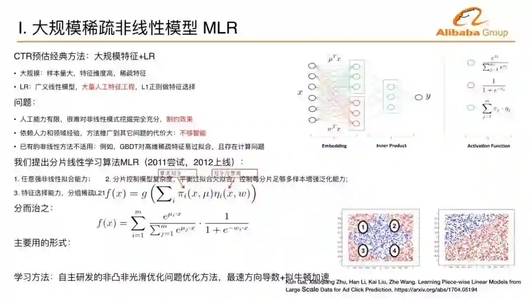 怎么学习这个学习模型是一个主要的问题。我们还加入了分组系数的技术,使得大数据下的模型有自动选择特征的能力。最终,它会转化成非凸非光滑的问题,这是在2011年提出的模型,2012年上线的算法。非凸非光滑的问题当时没有很好的手段,非光滑数学上表现的不是处处可导,数学上没有导数怎么进行下降也是一个问题。虽然不是处处可导,这个函数处处方向可导,我们用方向导数找到最快下降方向,并用拟牛顿法进行加速。这个工作的名称叫混合逻辑回归MLR,做过CTR预估的同学可能会知道这样一个工作。这是在我们探索深度学习在广告中应用的一个基础。