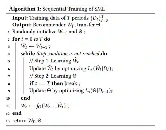 。将提出的表达转移组件用于对未来一段时间的推荐,以优化转移组件在推荐上的表现。除了对新收集的交互进行常规训练外,我们还对下一个时间段的未来交互进行了传输CNN训练。因此,CNN可以了解如何将旧参数与当前参数结合起来,目的是预测附近的用户互动。每个时间段的重新训练是一项任务,它具有当前时间段的新交互作为训练集,而下一时间段的将来交互作为测试集。训练集为历史数据与当前时段的新的交互,测试集为下一时间段的未来交互数据。具体顺序性的训练算法如下图所示: