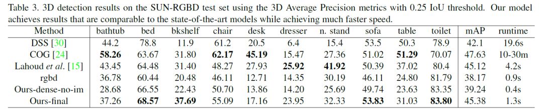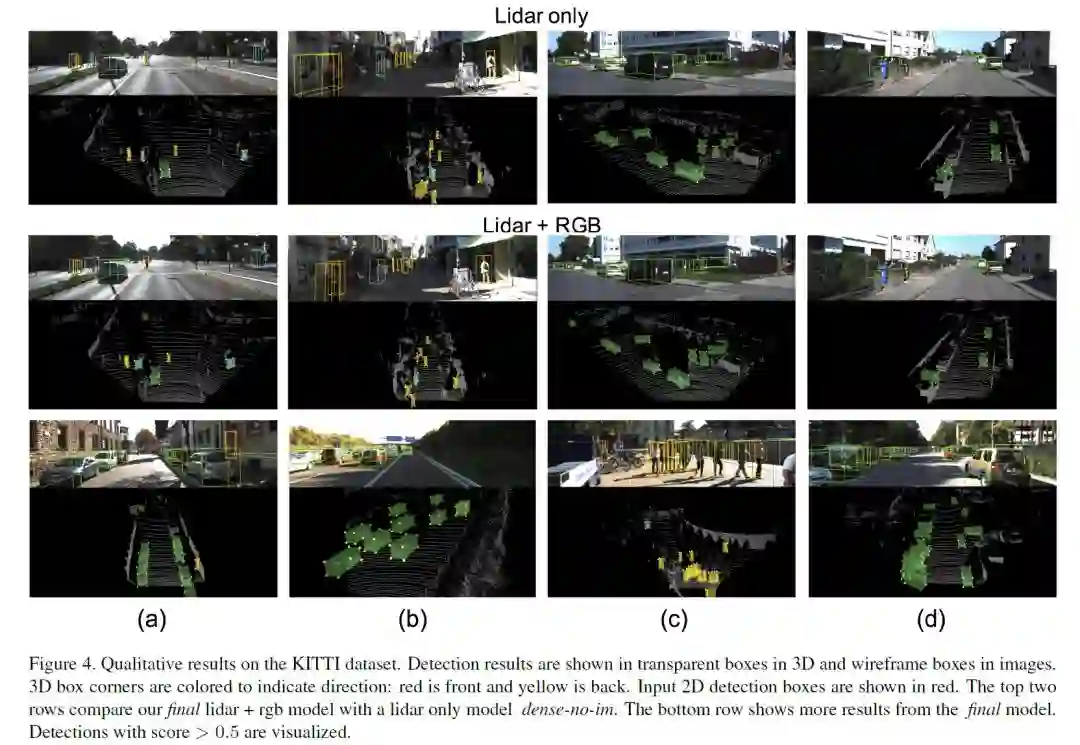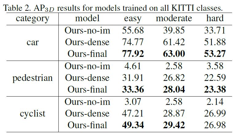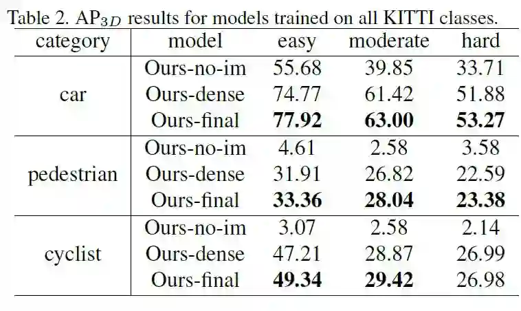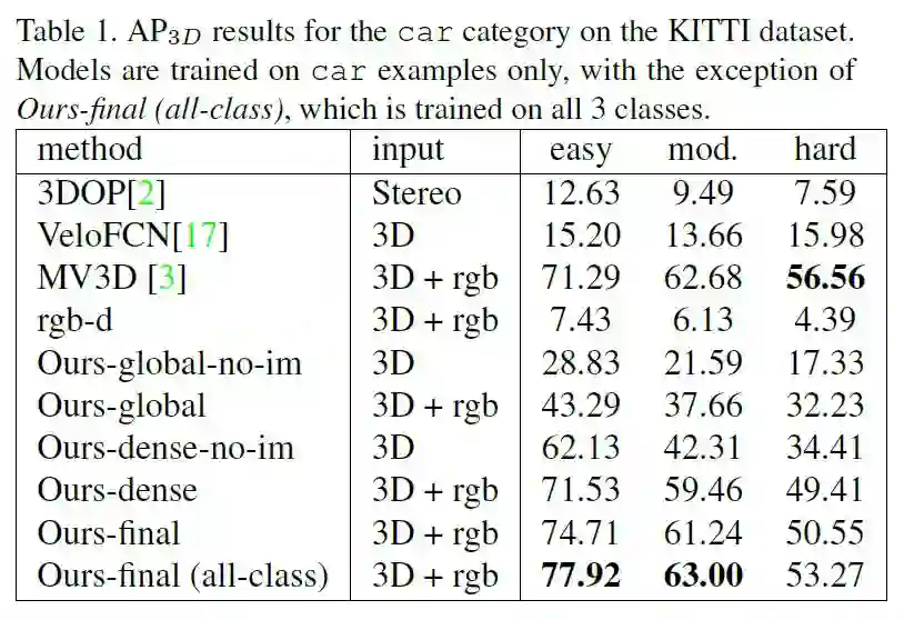 表1. KITTI数据集车辆分类精度,global表示仅适用global fusion;dense表示使用dense fusion + 监督评分函数;final表示dense fusion +非监督评分函数;no-im 表示仅使用lidar作为输入。
