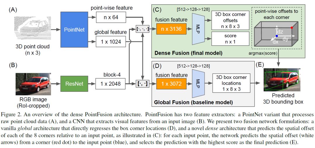 提出两种融合网络架构:一种是普通的全局架构(Global Fusion),直接从特征回归出box角点位置(D);第二个是提出一种新的逐点判断的稠密结构(Dense Fusion含义可参考CV中的dense prediction的意思),预测8个角点相对于输入点云的的空间偏置(C),每个点会有一个评分,最后选择得分最高到作为最后到预测结果(E)。