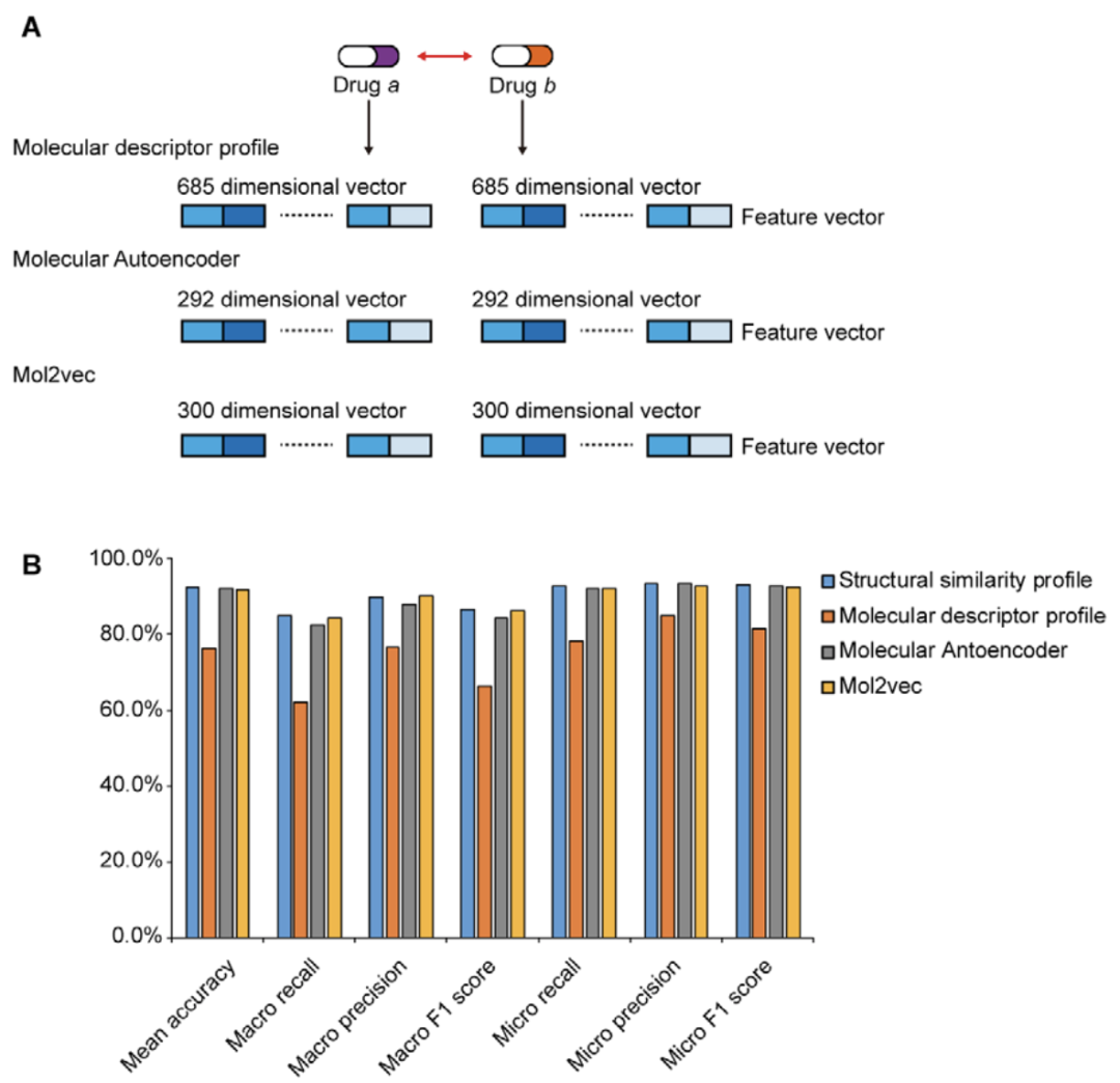 作者除了考虑SSP这种特征表示,还考虑了Molecular descriptor profile、Molecular Autoencoder和Mol2vec这三种特征表示(如下图A所示),发现SSP比Molecular Autoencoder和Mol2vec略微有点优势(如下图B所示)。