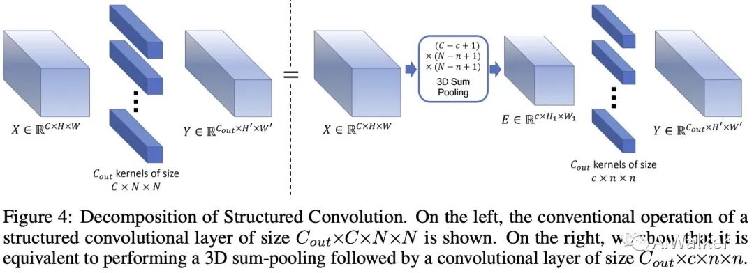 上图给出了一种更广义形式的卷积结构化分解示意图,而标准卷积、depthwise卷积以及point卷积可构建成3D结构核,这也就意味着上述分解适合于现有网络架构。
