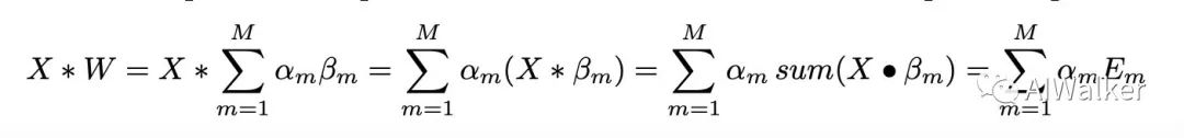由于 为二值张量,那么 就等价于X的相加操作,而无需乘法。对于卷积而言,它包含 个乘法以及 个加法;而这里,仅需要M个乘法,总的加法变成了: