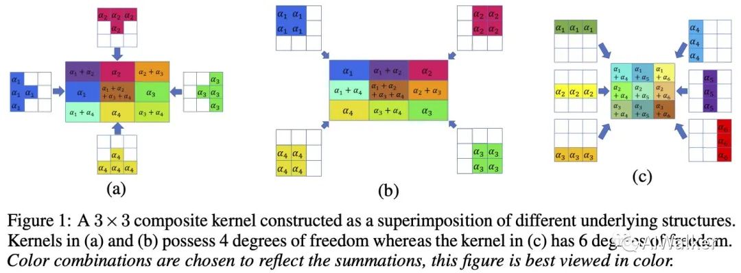 上面两个定义给出了与复合核相关的知识点,看公式还是比较难以理解的。下面我们就来看图示吧,见下图。它给出了一个3x3复合核 ,不知道各位同学有没有发现:其实它就是利用的卷积核的相加特性。