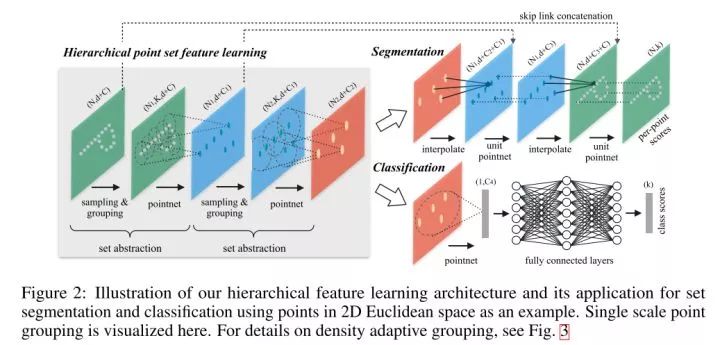上述各层构成了PointNet++的基础处理模块。如果将多个这样的处理模块级联组合起来,PointNet++就能像CNN一样从浅层特征得到深层语义特征。对于分割任务的网络,还需要将下采样后的特征进行上采样,使得原始点云中的每个点都有对应的特征。这个上采样的过程通过最近的k个临近点进行插值计算得到。完整的PointNet++的网络示意图如下图所示。