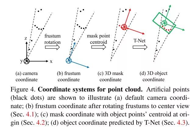 综上所述,F-PointNet是一个多步骤的3D目标检测算法。如下图所示,为了应对点云数据中各个目标的视角不变性和得到更准确的bbox回归(通过缩小需要回归的值的取值范围),算法需要进行三次坐标转换。模型的loss和2D的目标检测一样是包含分类以及回归的多任务loss。同时,作者提出了一种被称为corner loss的损失函数来对目标的中心、朝向和大小进行联合优化,避免由于某一方面的不准确而主导loss。