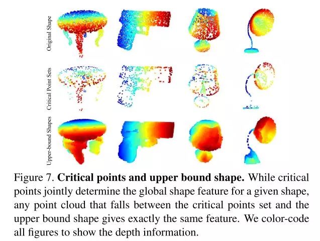 定理2(a)说明对于任何输入数据集S,都存在一个最小集Cs和一个最大集Ns,使得对Cs和Ns之间的任何集合T,其网络输出都和S一样。这也就是说,模型对输入数据在有噪声(引入额外的数据点,趋于Ns)和有数据损坏(缺少数据点,趋于Cs)的情况都是鲁棒的。定理2(b)说明了最小集Cs的数据多少由maxpooling操作输出数据的维度K给出上界。换个角度来讲,PointNet能够总结出表示某类物体形状的关键点,基于这些关键点PointNet能够判别物体的类别。这样的能力决定了PointNet对噪声和数据缺失的鲁棒性。如图所示,作者通过实验列出了PointNet学习到的以下几个物体的关键点。