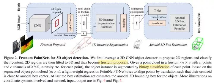 上述的PointNet和PointNet++主要用于点云数据的分类和分割问题,Frustum-PointNet(F-PointNet)将PointNet的应用拓展到了3D目标检测上。目前单纯基于Lidar数据的3D目标检测算法通常对小目标检测效果不佳,为了处理这个问题,F-PointNet提出了结合基于图像的2D检测算法来定位目标,再用其对应的点云数据视锥进行bbox回归的方法来实现3D目标检测。F-PointNet的网络结构如下图所示。