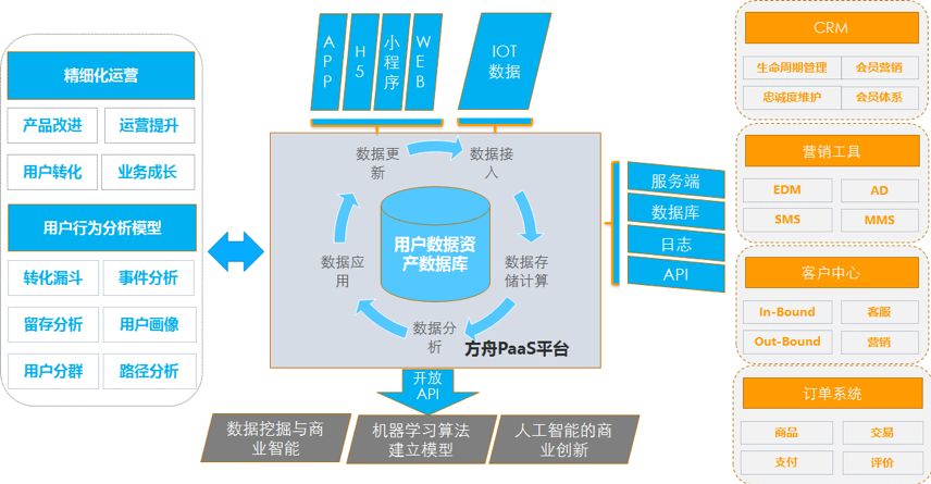 这个模式比较典型的一个实现就是易观方舟,易观方舟以IOTA架构安装到企业内部,帮助企业建立用户行为分析这个CDM的数据河,以“主、谓、宾”的模式打通企业内部用户的各种行为,直接提供给产品和运营做相关的数据分析,同时也是一个PaaS平台,可以供给给其他数据耕种者继续再次加工。