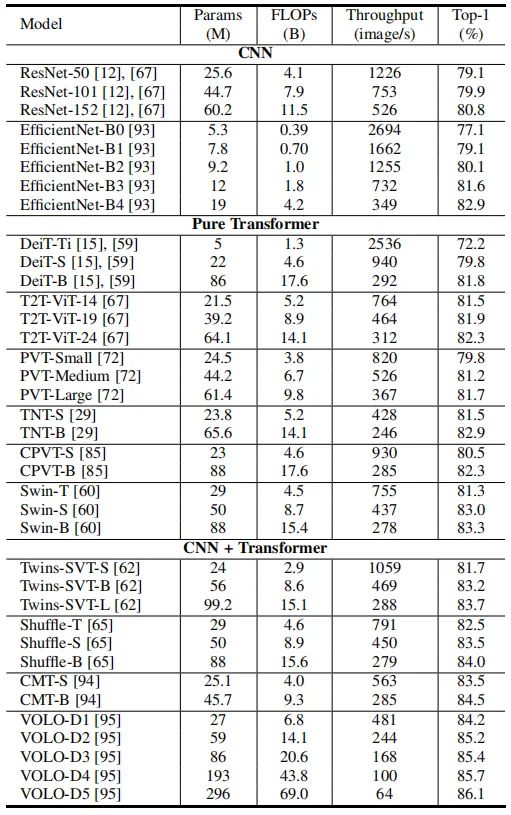 视觉 Transformer 的所有组件,包括多头自注意力、多层感知机、残差连接、层归一化、位置编码和网络拓扑结构,在视觉识别中起着关键作用。为了提高视觉 transformer 的精度和效率,业界已经提出了许多模型。下表总结了视觉 Transformer 骨干网络的结果,可以更好分析现有网络的发展趋势。从图 2 中的结果可以看出,将 CNN 和 Transformer 结合起来可以获得更好的性能,这表明卷积的局部连接和注意力的全局连接能够相互补充。