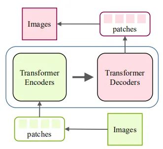 底层视觉是计算机视觉领域的一个重要问题,如图像超分辨率和图像生成等,而目前也有一些工作来研究如何将 Transformer 应用于底层视觉中来。这些任务通常将图像作为输出(高分辨率或去噪图像),这比分类、分割和检测等高层视觉任务(输出是标签或框)更具挑战性。图 3 和图 4 展示了在底层视觉中使用 Transformer 的方式。在图像处理任务中,首先将图像编码为一系列 token,Transformer 编码器使用该序列作为输入,进而用 Transformer 解码器生成所需图像。在图像生成任务中,基于 GAN 的模型直接学习解码器生成的 token,通过线性映射输出图像,而基于 Transformer 的模型训练自编码器学习图像的码本,并使用自回归 Transformer 模型预测编码的 token。而一个有意义的未来研究方向是为不同的图像处理任务设计合适的网络架构。