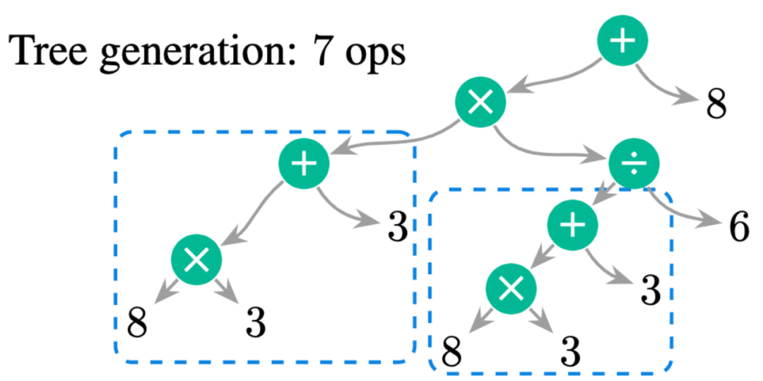 目前流行的数学解题方法主要是 sequence-to-sequence (Seq2Seq) 以及 sequence-to-tree (Seq2Tree) 的方法。针对 Seq2Seq 的方法,优点是简单直接,缺点是需要有非常大量的数据才得到好的效果,否则效果不如结构化模型 Seq2Tree。Seq2Tree 主要的代表工作是 Goal-Driven Tree-Structure (GTS) [4],目前也是大家比较频繁借鉴的工作。同时 Seq2Tree 也有可以改进的地方,如下图所示,生成的过程是一个前序遍历 (pre-order traveral) 的过程,会先生成顶端的数学运算符 (operator),然后是 operator 左边的运算,最后是右边的运算。生成的过程相对来说比较不符合直觉,并不是一个一步步计算的过程。此外,我们可以看到同一个表达式 8×3+3 被生成了 2 次,然而我们其实是可以重复使用这个表达式的结果。但在 Seq2Tree 的方法中,我们无法这样去使用,必须重新生成整个子树结构。