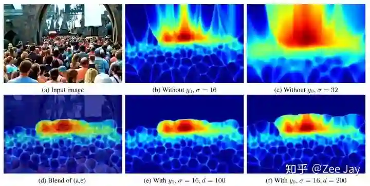 这里越亮越表示模棱两可,越暗表示越明确是人或是背景,然后图中可以看到基本上人头区域都是暗的,人头边界和部分背景比较亮,符合后验概率的计算原理,σ越小图越清晰,因为小的σ不容易导致两个人头区域有重叠,d越小,则表示某个点更容易倍判断为背景,图中的e比f人头轮廓更合理,是因为被判断为背景的点更多。