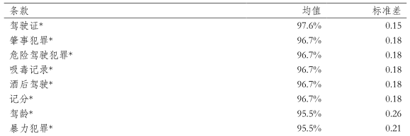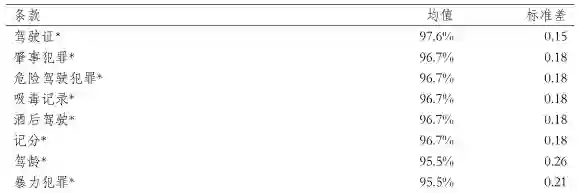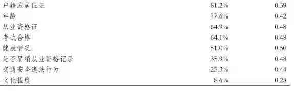 (3)驾驶员:户籍或居住证、驾驶证、驾龄、年龄、肇事犯罪、危险驾驶犯罪、暴力犯罪、吸毒记录、酒后驾驶、记分、考试合格、交通安全违法行为、是否吊销从业资格记录、文化程度、健康情况、从业资格证。