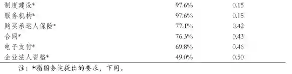 此外,对车辆和驾驶员的要求存在较强的相关关系(相关系数为0.55,且在 0.01 的水平上统计显著),说明对车辆要求严格的城市也会对驾驶员提出较强的要求。