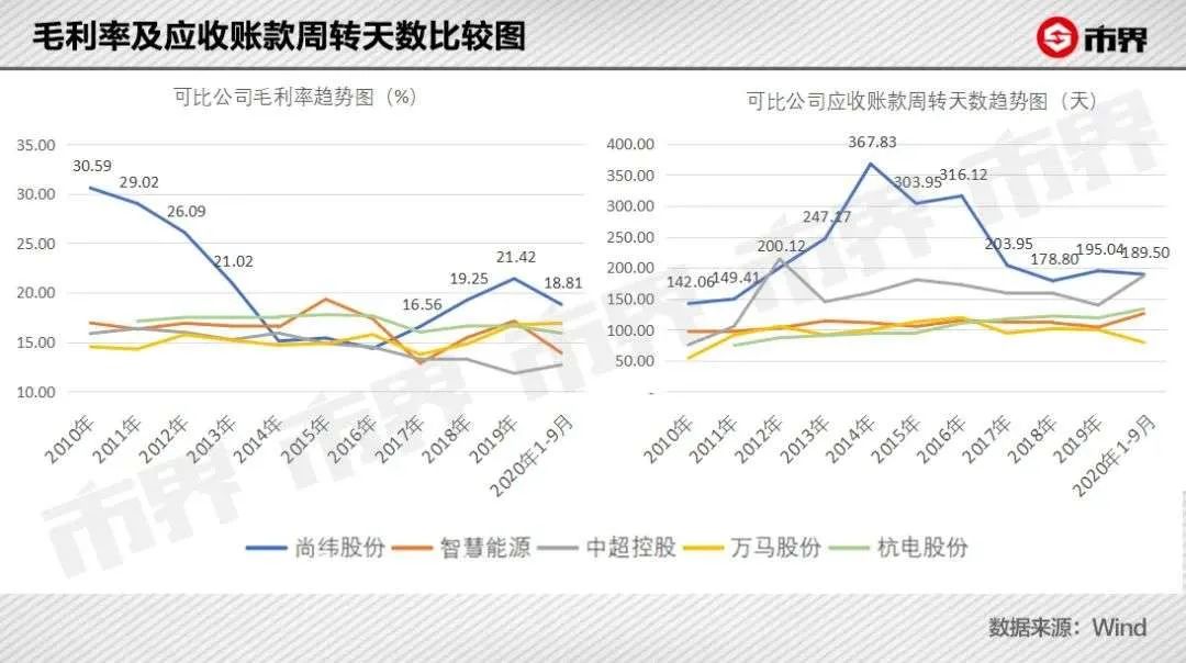 通常来说,毛利率越高,说明一家公司在同行业内的议价能力越强,那么与此相对应的应收款周转天数就会越短。电缆行业中包括智慧能源、中超控股、万马股份和杭电股份在内的几家可比公司,基本上都遵循着这种次序排位。