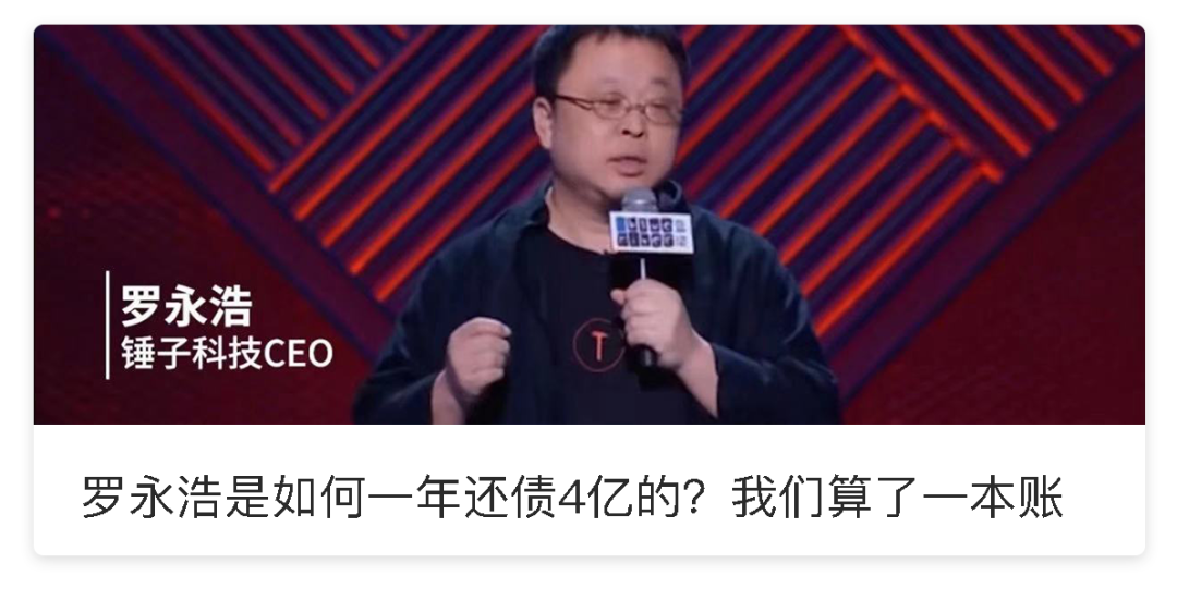 罗永浩曾在接受《人物》杂志采访时表示,这辈子出现这么大笔债务之前,他从来没有做任何一件事时,包括开公司,把赚钱放到第一位。