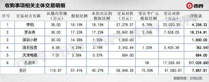 但更蹊跷的是下面这个附加条件:尚纬股份花5.89亿元收购星空野望的同时,包括李钧(小野电子烟联合创始人)、罗永秀(罗永浩兄弟)、深圳小野(小野电子烟运营主体)和孔剑平在内的四方,需要以合计5.11亿元为对价,买下尚纬股份二股东李广元15%的股权。