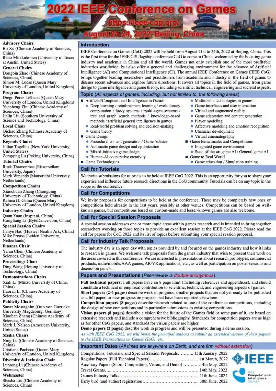 【通知】IEEE CoG 2022征稿(含大会报告信息)