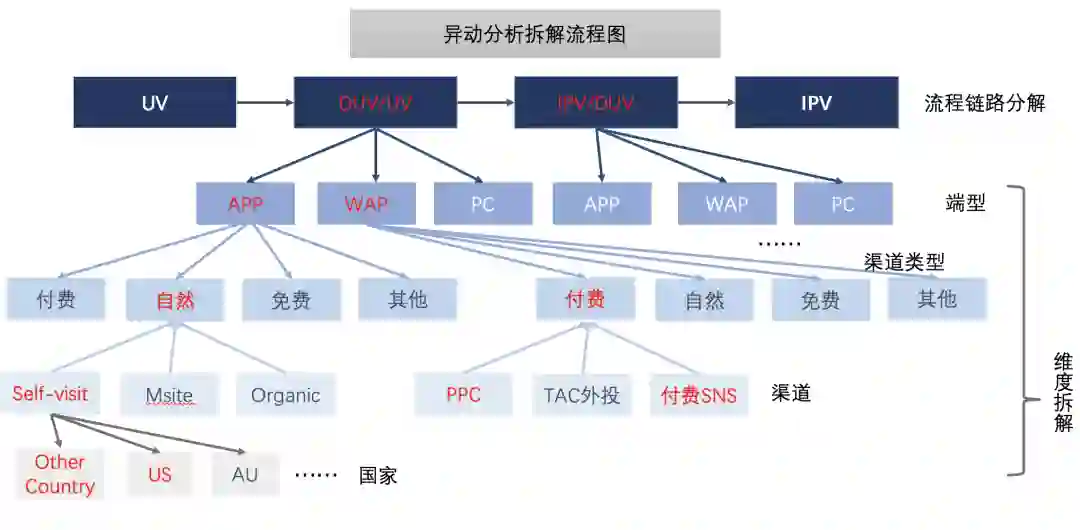 红色表示的链路指标或维度代表对总值下跌贡献率较大,经过一层一层的拆解定位到app端自然流量中转化的降低导致总转化下降。