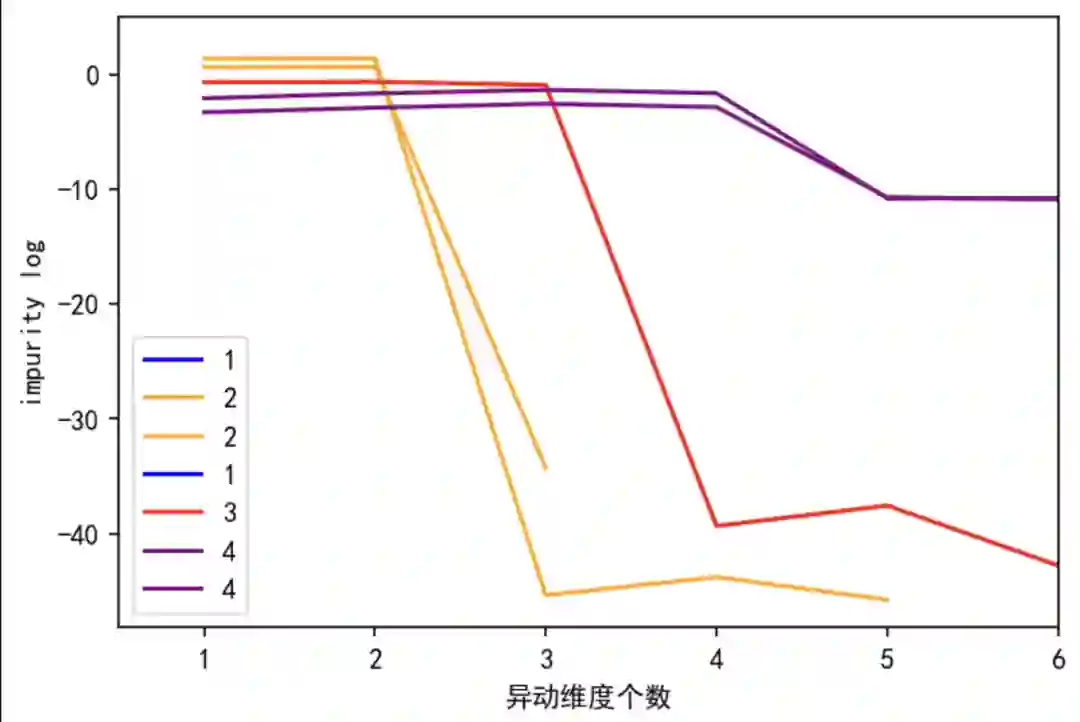 往下分的信息增益高。图五表示异动维数的个数与决策树层结点熵的平均数的关系:以黄线为例, 当异动的维数为2时,决策树在第二层的熵最高,从第二层往后,再往下分熵越小,信息增益少,过拟合明显。从折线明显看到,熵的拐点在第二层,决策树最大深度等于2。