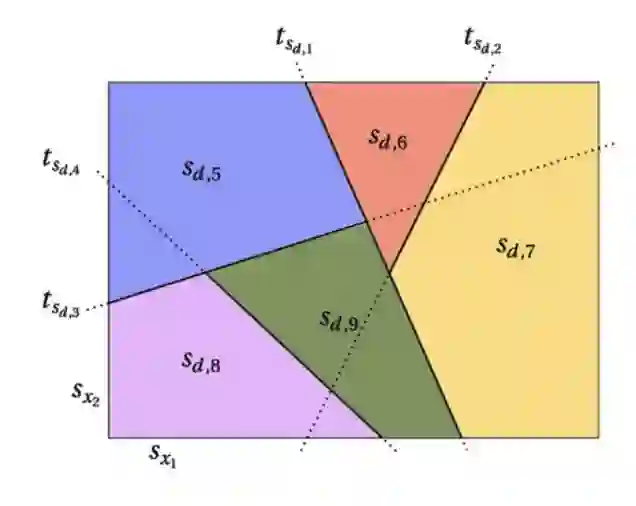 表示两个维度,其下角标表示维度下的维值。下图具象的看出通过不同维值的组合,把数据空间切割成不同块,用不同的颜色代表。