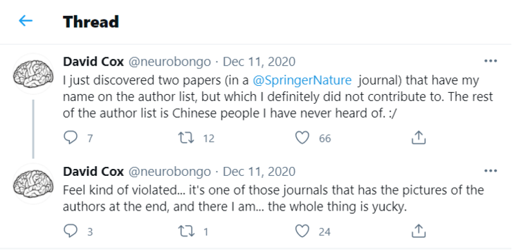 文章指出,中国学者涉嫌冒用前哈佛副教授、MIT-IBM Watson AI 实验室总监David Cox的名字发表学术论文。David Cox已公开证实此事件,并在Twitter发文称“整个事件让人感到恶心”。