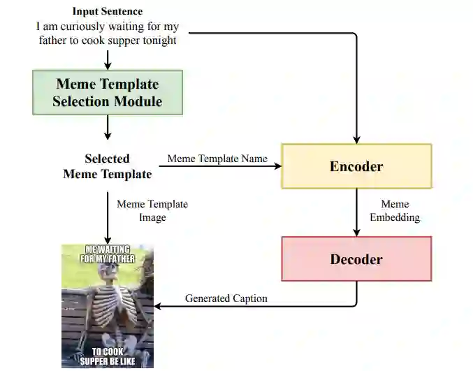 memeBot 模型架构图。对于给定输入序列,通过结合模板选择模块(template selection module)选择的和标签生成 transformer(caption generation transformer)生成的表情包标签来创建新的表情包。