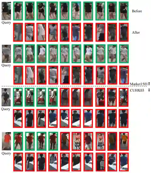 Market-1501 和 CUHK03 上 AlignedReID 被攻击前后的 Rank-10 结果。绿色代表正确匹配。红色代表错误匹配。