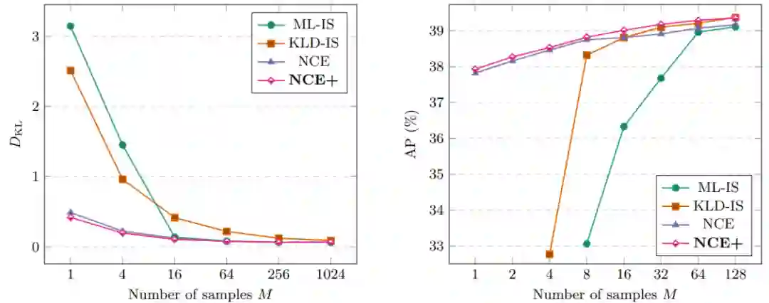 图左:用于 1D 回归实验的四种表现最佳方法的详细比较;图右:COCO-2017 Val 数据集上,用于目标检测实验的四种表现最佳方法的详细比较。四种方法均分别为 ML-IS、KLD-IS、NCE 和本研究提出的 NCE+。