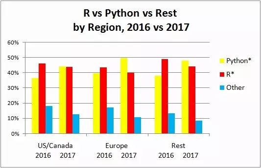 图4:2016-2017年,不同地区使用Python、R语言和其他语言的情况