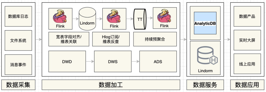 数据模型及任务加工分层:在DWD层按照主题将不同数据源数据整合,并且输出到Lindorm,然后通过Hlog订阅,触发流任务反查事实表,将宽表字段对齐输出到TT,做为DWD中间层存储。构建可复用的DWS层,将常用维度及指标按照主题建模,供下游复用,减少烟囱化。