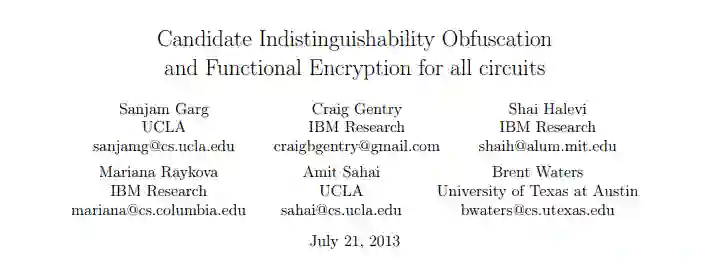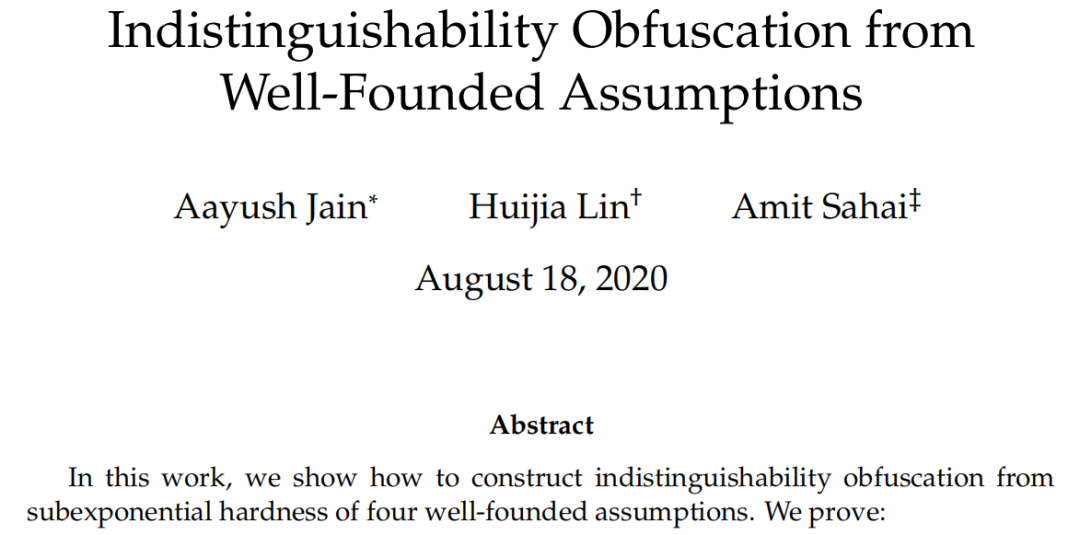 作者 | 蒋宝尚 编辑 | 青暮在密码学中,一直存在一种黑科技般的概念:Indistinguishability Obfuscation。中文翻译为不可区分混淆,简称为iO。 iO是否存在一直是个迷,学者们为了论证它也打了非常多的“架”。这个概念(iO)又称为Crypto-complete(密码学完备)的,如果它真的存在,那么就可以基于IO构建出几乎所有的密码学构造,包括但不限于公钥加密、函数加密、数字水印.......此概念自美国加州大学洛杉矶分校的Sahai教授及其合作者们提出之后,有人狂热,有人鄙夷。有学者称:“随着时间的推移,相信它存在的狂热分子越来越少了。”iO的出现最初是为了保护软件不被破解。其基本思想是:将程序转换为一种称为多线性拼图的游戏(multilinear jigsaw puzzle),从而将混淆技术的安全性转化为一类与格(lattice)有关的数学难题。换句话说,其利用的原理是:如果你使用两个同等的程序 A 和 B(如把相同值输入到 A 或 B 里去产生相同的输入)计算得到 O(A)=P 和 O(B)=P,则在无法进入程序 A 或 B 的情况下,则在计算上分辨 P 来自于 A 还是 B 是不可行的。可以看出,这个问题在理论上很容易定义,但是符合人们期望的混淆技术在理论上是否存在还是一个很困难的问题。8月18日,来自华盛顿大学和加利福尼亚大学的三位研究者发表了一篇名为“Indistinguishability Obfuscation from Well-Founded Assumptions”的文章,在文章中作者用“标准”的安全假设构建了IO。这三位作者中,Huijia Lin本业毕业于浙江大学,2011年在康奈尔大学获得博士学位,目前是华盛顿大学的副教授。具体而言,他们证明了四个假设:1.关于素数阶为p=O(2^λ)的非对称双线性群的SXDH假设,2.在Zp上的LWE假设,次指数模数噪声(subexponential modulus-to-noise ratio)比为2^(ke)。3.在Zp上的LPN假设,且具有多项式的LPN样本和错误率1/L^δ。4.Boolean PRG在NC^0中的存在性。有了上述四个假设,那么IO对于所有的多项式逻辑线路(polynomialsize circuits)都是存在的。此篇论文的作者之一在接受采访中表示,新的研究结果应该会让IO怀疑论者安静下来。“现在,人们将不再怀疑IO的存在。”