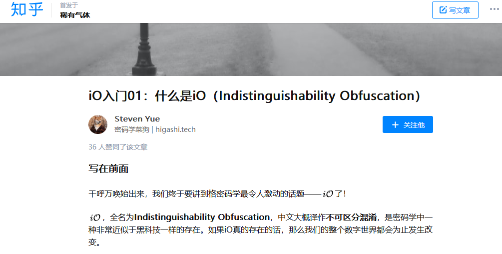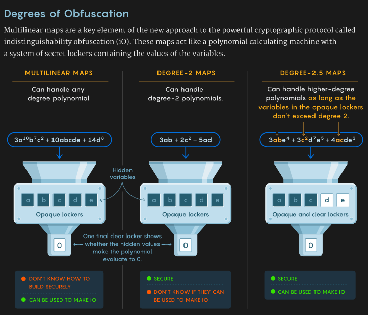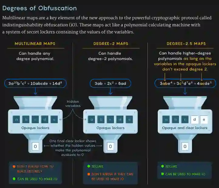 2013年Sahai联合其他五位学者发布文章“Candidate Indistinguishability Obfuscation and Functional Encryption for all circuits”,提出IO协议,其基本思想正如前面提到的“把一个程序转换为一种称为多线性拼图的游戏(multilinear jigsaw puzzle),从而将混淆技术的安全性转化为一类与格(lattice)有关的数学难题。”这一混淆技术从概念上来看,具备了黑箱混淆器的大多数特性。当时也被称为一种突破,并引发了数十篇后续论文。但在提出的几年内,已遭受了领域内一大批专家(包括提出者)的第一轮攻击。后来有研究者证明:在混淆过程,使用多线性映射是不安全的。这时候IO是否存在的质疑声又甚嚣尘上。2016年,在本科毕业于浙江大学,现在是华盛顿大学副教授的Huijia Lin,开始研究有可能减少对多线性配对(Multilinear maps)的需求,从而绕过IO机制的弱点。确实,多线性配对存在致命的缺点。多线性配对本质上只是用多项式计算的一种方式。它由数字和变量之间的和与乘积组成,如3xy+2yz^2。这些映射需要一个类似多项式计算器的东西,连接到一个包含变量值的“秘密储物柜系统”。用户在机器上输入一个机器接受的多项式时,可以查看最后一个储物柜。从而找出隐藏的值是否使多项式的值为0。因此,打开最后一个“储物柜”的过程中,透露了本应隐藏的计算信息。接下来几年中,她发现,减少使用多线性配对确是可行!紧接着,她把多线性配对的维度(层数)降到了5层。同在2017年的时候,她与Tessaro在中成功的把这一要求降到了3层。这也就是说,只要我们拥有一个三线性配对(Trilinear Map)的构造,就可以IO。但是,这时候又有学者质疑:从论文上看,这似乎是一个巨大的进步,但是从安全的角度来看,3次好像还是差点意思。于是,Huijia Lin 与 Jain以及Sahai联手探索2次多线匹配的方法。但是研究过程似乎陷入了沉默之中,久久找不到方向。后来另一位研究区块链的学者Christian Matt提出了一种折中的方法,由于IO似乎需要3次,但计算机科学家只有2次,是否有一种介于两者之间的东西?2.5次?后来Huijia Lin也考虑到,这些只用2.5次的“混合储物柜”系统可以安全地建造。.基于这种并不需要强大的多线性配对思想,Huijia Lin和她的团队发明了一种新型的伪随机性生成器。此随机生成器可以将一串随机比特扩展成更长的字符串,其随机性足以愚弄计算机。以上就是Jain、Lin和Sahai在他们的新论文中想出的方法。另外,论文中的方案依赖于四个数学假设,这些假设在其他密码学环境中已经有了广泛应用。即使是研究最少的假设—LWE假设(learning parity with noise),在20世纪50年代就有了相关研究。但是,虽然证明了iO存在性,但仍然有一样东西能够破坏所有的美好:量子计算机。如果量子计算机建成了,那么四个假设就很容易受到量子攻击,IO的理论就会受到威胁。另外,有三篇独立的论文也提供了一条不同的通往IO的潜在途径,即使面对量子攻击也可能是安全的。研究人员称:“此版本的IO依赖于不那么确定的安全假设”。 参考资料:https://www.quantamagazine.org/computer-scientists-achieve-crown-jewel-of-cryptography-20201110/