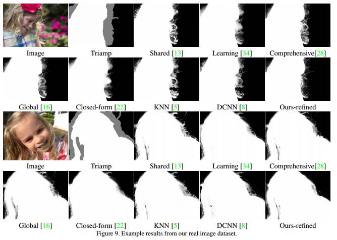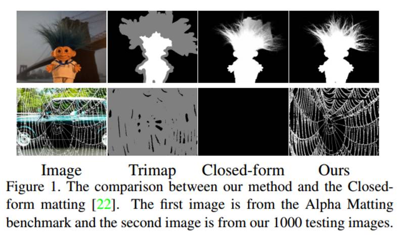 为了泛化到自然图像中,抠图算法必须超越以色彩作为主要线索,并能利用更加结构性和语义性的特征(structural and semantic features)。在该项研究中,我们展示了一种神经网络,它有足够的能力捕捉到高层次特征(high-order features),并利用它们计算且提升抠图效果。实验还展示了我们的方法不仅在标准数据集上优于以前的方法,而且它在泛化到真实图像上也显著地比现存算法表现更优良一些。