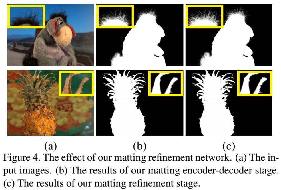 图 4:抠图精炼网络的效果。a) 输入图像。b) 编码-解码阶段的输出。c) 精炼阶段的输出结果