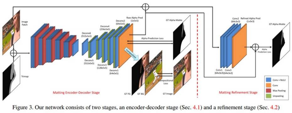 我们通过深度学习解决抠图问题。给定一个新的数据集(大规模抠图数据集),我们的神经网络能充分利用这些数据进行训练。并且该神经网络由以下两个阶段组成。